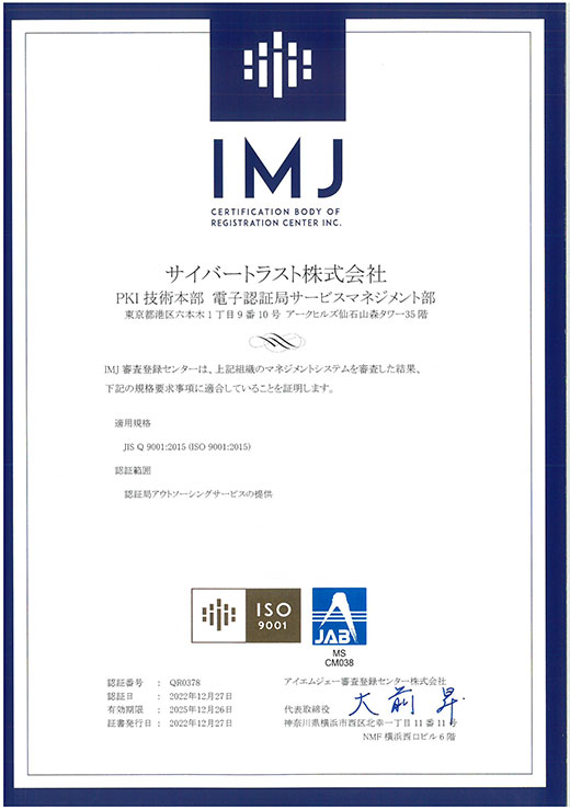 サイバートラストは、認証局アウトソーシングサービスの提供について、品質マネジメントシステムの国際規格「ISO9001:2015」の認証を取得しました。