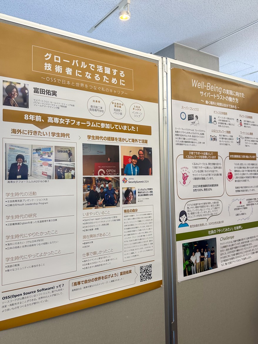 先日、12 月 8 日に開催された高専女子フォーラムに参加しました。高専女子フォーラムは、高専の女子学生を対象とした、女子学生のキャリア教育のためのイベントです。私も高専の情報工学科出身ということで、かつては女子高専生でした。今回、サイバートラストにエンジニアとして採用されてから現在フィールドマーケティング部で働く自身のキャリアをもとに女子学生に向けたメッセージを伝えるべく参加しました。今回は、高専女子フォーラムの様子と、自身のキャリアについてご紹介したいと思います。