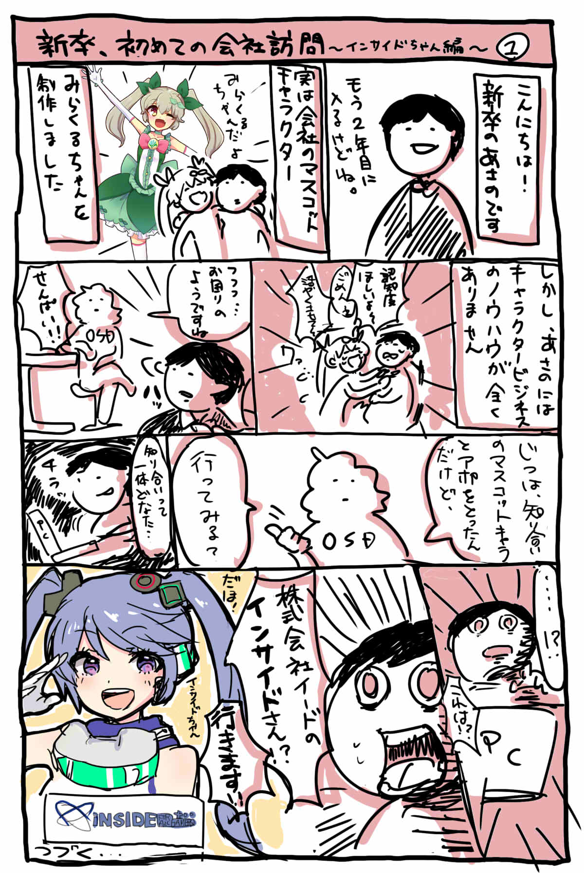 2017 年新卒が、キャラクタービジネスを学びに会社訪問に行きました!当社のマスコットキャラクターのみらくるちゃんをより活躍させるためがんばっています!今回は株式会社イード / インサイドのインサイドちゃんにお会いした様子をレポートの漫画にしています。
