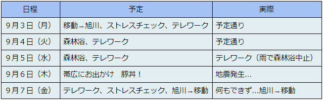 旭川滞在中には、バイタルデータの測定のほか、テレワークや森林浴を行います。