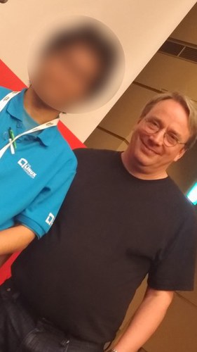 この対談を含め Keynote が終わった後、予定では後のセッションのためにホールの整理をする事になっていましたが、いつの間にか Linus 氏とのサイン・撮影会が始まっていました (Linus 氏はあまりサインや撮影会に積極的ではなかったみたいですが。。。)。