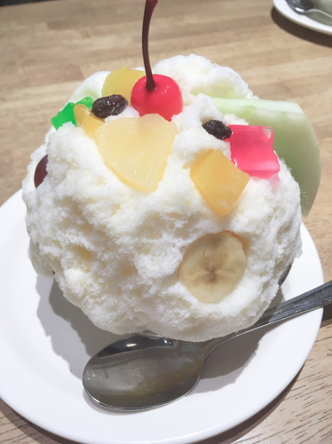 天文館で、おやつに しろくま をたべました。鹿児島といえば しろくま ですね。(普通のしろくまは量が多いのでベビーサイズです。)