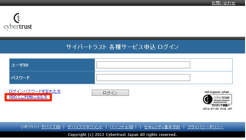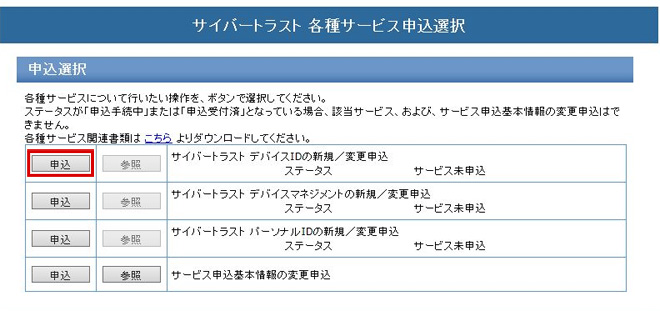 5. [サイバートラスト 各種サービス申込選択]画面が表示されます。デバイス ID の[申込]ボタンをクリックします。