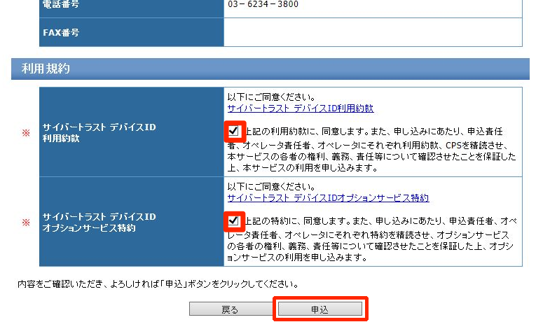 表示された入力内容をご確認頂き、「サイバートラスト デバイスID利用約款」および、オプションサービスをお申込みの場合には「サイバートラスト デバイス ID オプションサービス約款」をご一読のうえ、「同意します」をチェックし、[申込]ボタンをクリックします。