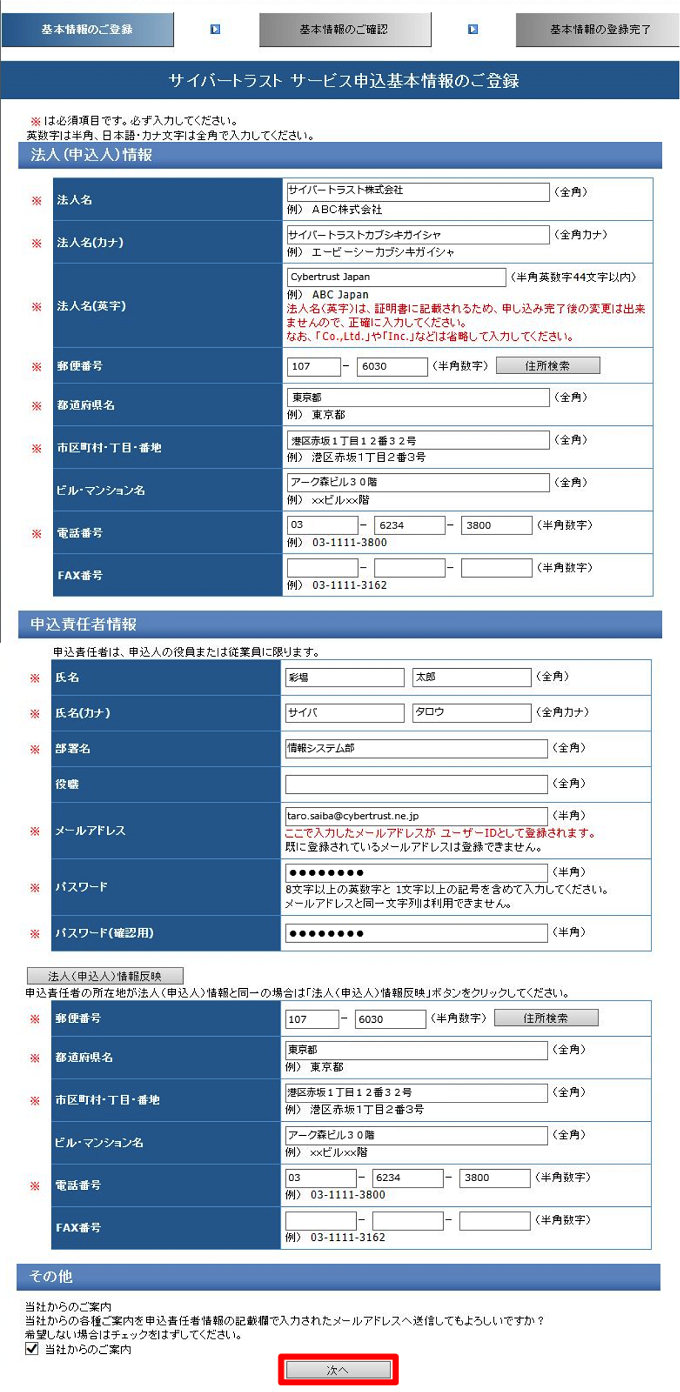 2. [サイバートラスト サービス申込基本情報のご登録]画面が表示されます。下記の例を参考にして、以下の情報を入力してください。