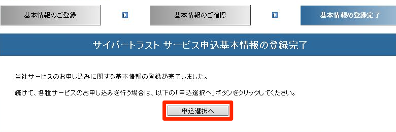 4. [サイバートラスト サービス申込基本情報の登録完了]画面が表示されます。[申込選択へ]ボタンをクリックします。