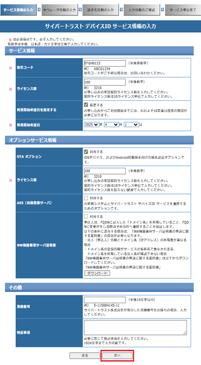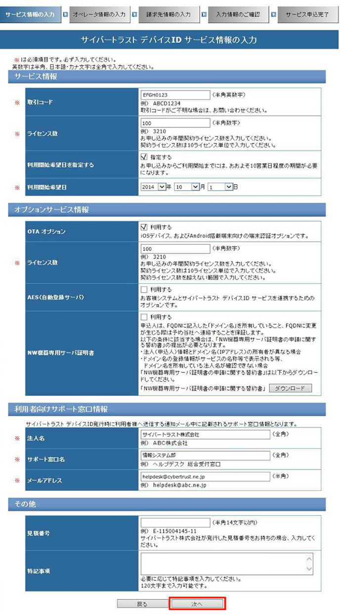 6. [サイバートラスト デバイス ID サービス情報の入力]画面が表示されます。下記の例を参考にして、以下の情報を入力してください。