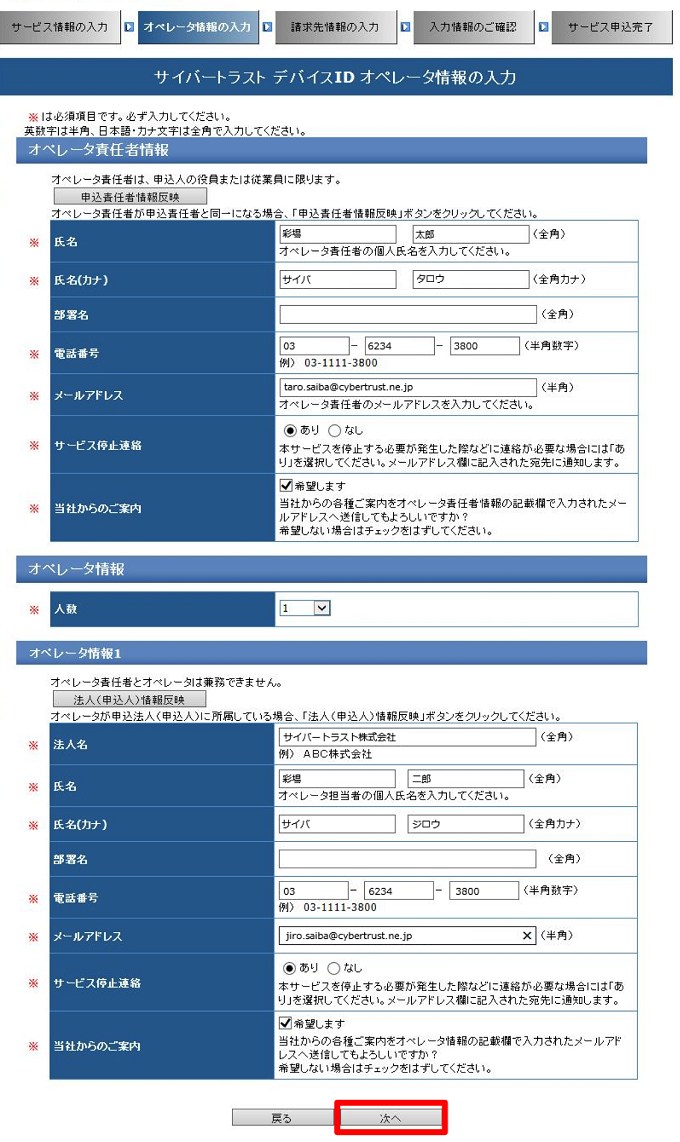 7. [サイバートラスト デバイス ID オペレータ情報の入力]画面が表示されます。下記の例を参考にして、以下の情報を入力してください。
