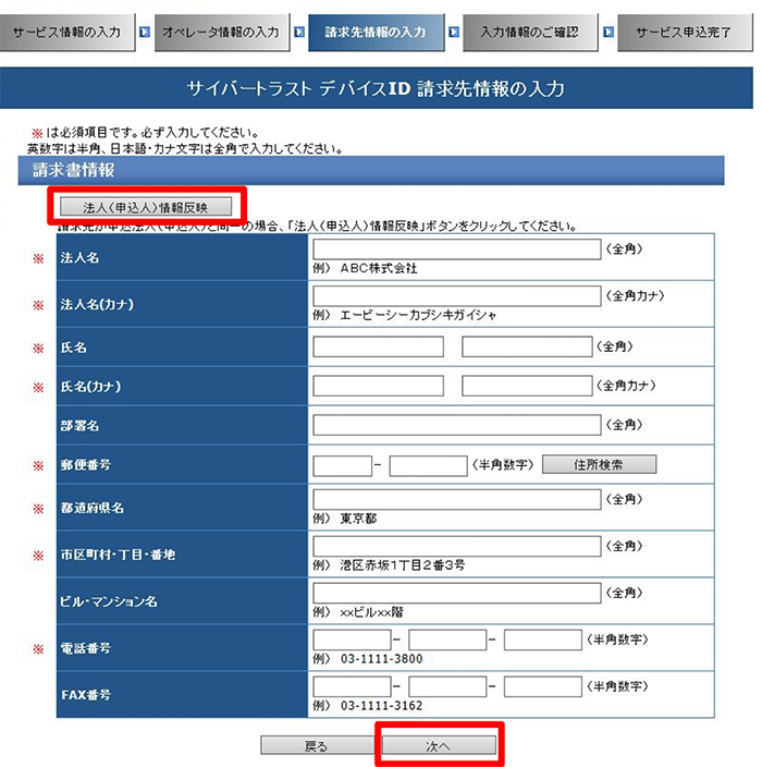 8. [サイバートラスト デバイスID 請求先情報の入力]画面が表示されます。請求先情報のご登録をお願いします。 請求先が申込法人(申込人)と同一の場合は、[法人(申込人)情報反映]ボタンをクリックしてください。 販売パートナーからのご購入の場合は、[請求先情報の入力]画面は表示されません。