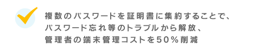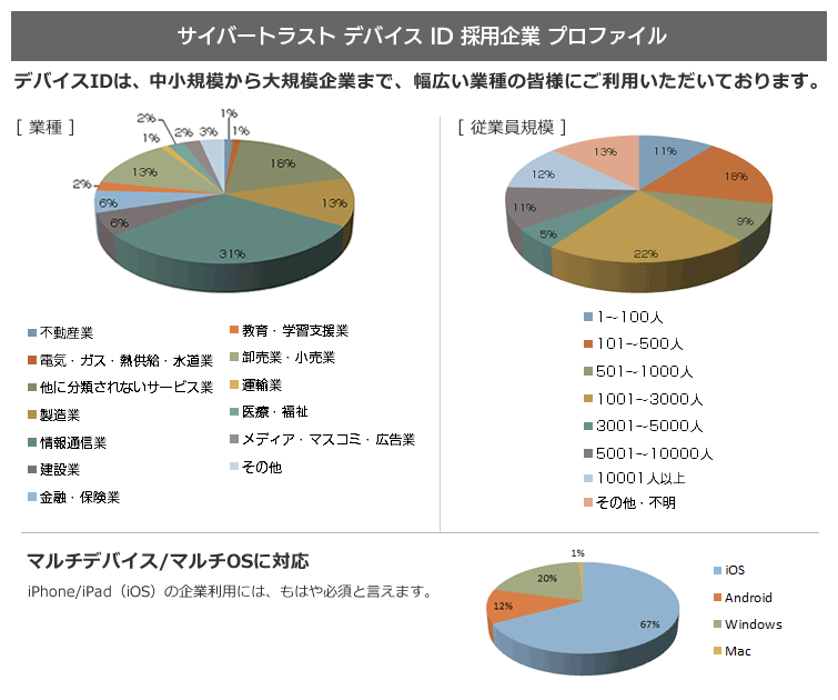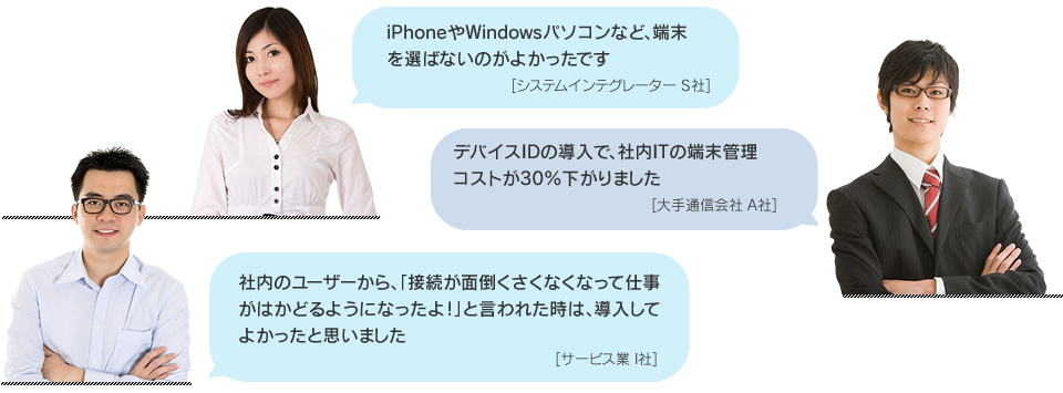 ![iPhoneやWindowsパソコンなど、端末を選ばないのがよかったです [システムインテグレーター S社]、サイバートラスト デバイスIDの導入で、社内ITの端末管理コストが30%下がりました [大手通信会社 A社]、社内のユーザーから、「接続が面倒くさくなくなって仕事がはかどるようになったよ!」と言われた時は、導入してよかったと思いました [サービス業 I社]](img/voice_img.png)