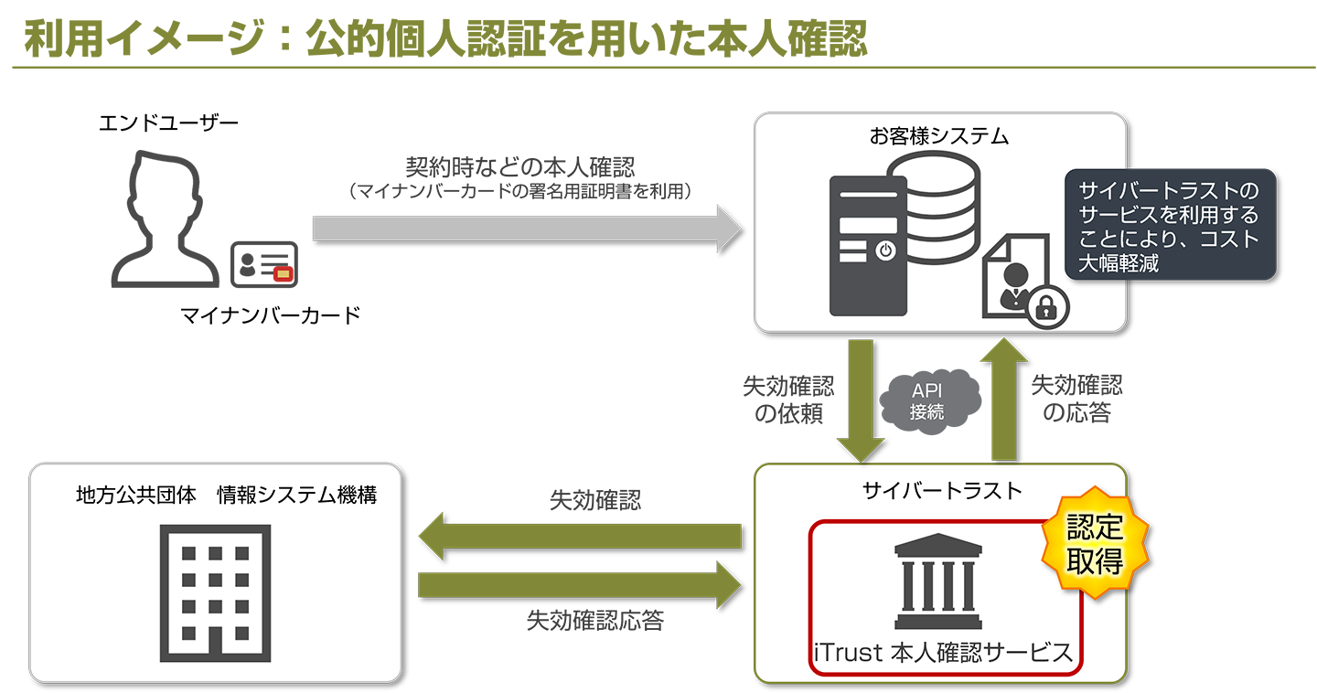 マイナンバーカードによる公的個人認証を利用するには、初期の設備投資やシステム開発、主務大臣認定の取得とその後の厳格な運用といった負担を要しますが、本サービスを利用することで、これらは一切不要となります。