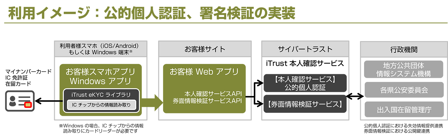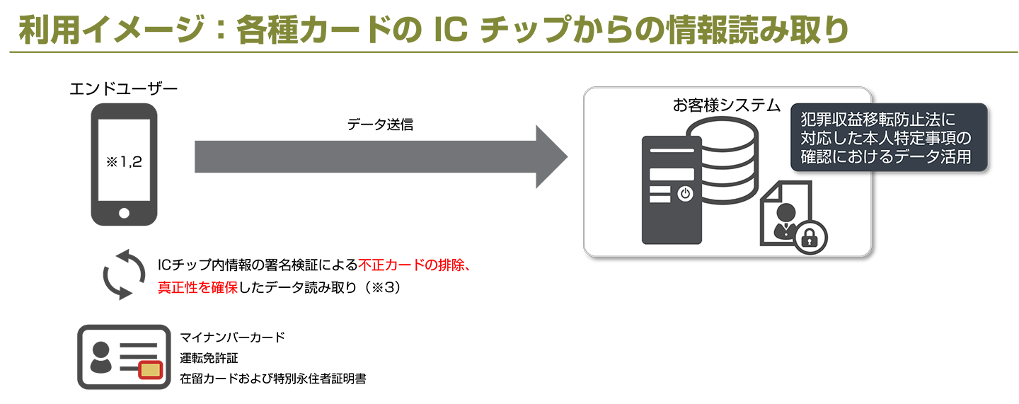 マイナンバーカード、運転免許証、在留カードおよび特別永住者証明書の IC チップから情報を取得するための、スマートフォン(iOS/Android)、Windows アプリに組み込む eKYC ライブラリを提供します。eKYC ライブラリにより、既存のお客様アプリにおける IC チップ読み取りを簡易に実現できます。