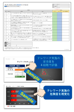 - 総務書「テレワークセキュリティガイドライン」約 20 項目のチェック、リスクの可視化と対策の提示。