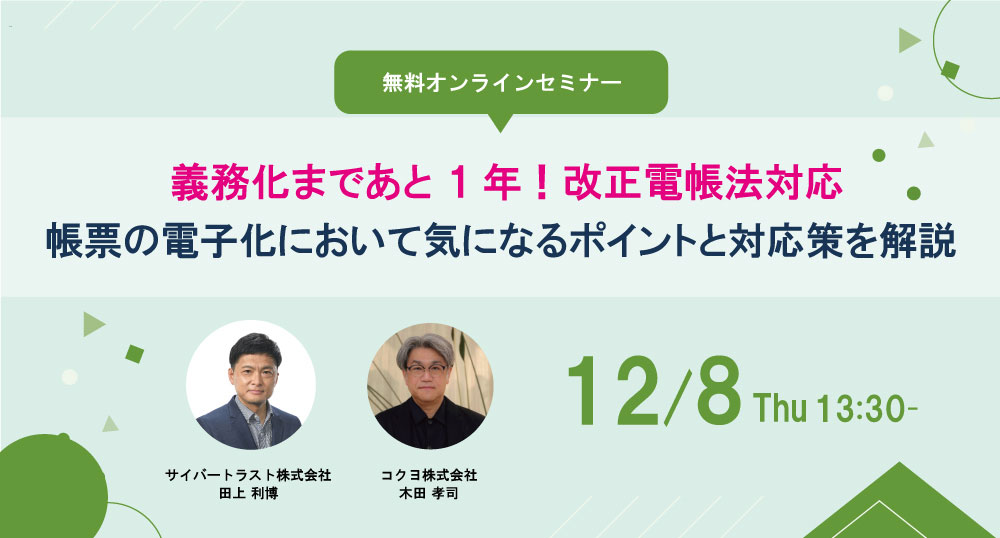 【ウェビナー】義務化まであと 1 年!改正電帳法対応~ 帳票の電子化において気になるポイントと対応策を解説 ~【12 月 8 日開催】
