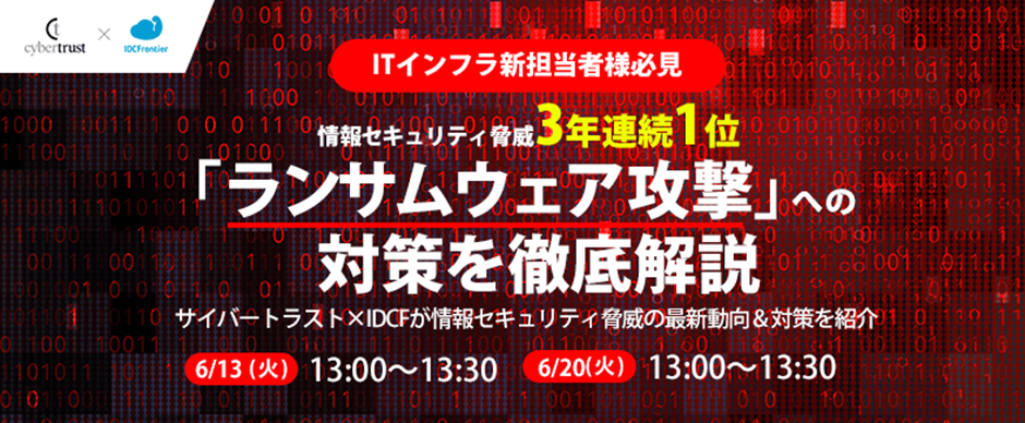 | 名称 | 【IT インフラ新担当者様必見】情報セキュリティ脅威 3 年連続 1 位「ランサムウェア攻撃」への対策を徹底解説 ~サイバートラスト×IDCF が情報セキュリティ脅威の最新動向&対策を紹介~ |