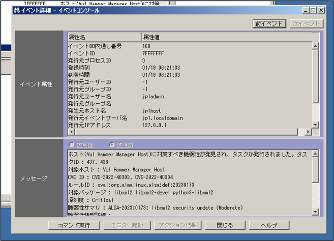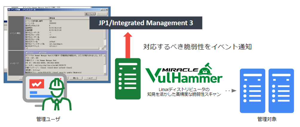 MIRACLE Vul Hammer は、システムに内在する脆弱性をスキャンし、対応状況の管理を自動化する脆弱性管理ツールです。JP1/Integrated Management 3 との連携により、MIRACLE Vul Hammer で検知した脆弱性情報を JP1 Integrated Management 3 へ通知することが可能になります。