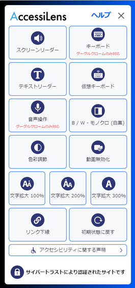 このたび、Web アクセシビリティ対応ツール「アクセシレンズ」に、サイトの安全性を可視化する新機能を追加いたしました。新機能では、アクセシレンズを導入したサイトの SSL/TLS サーバー証明書がサイバートラストの「SureServer」である場合、ツール上に「サイバートラストにより認証されたサイトです」と表示され、サイト訪問者に安全で信頼できるサイトであることをアピールできます。