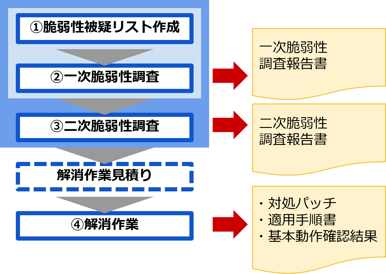 - 対策確認のためのテストを実施します。 対策とテストの内容について調査報告書に反映します。
