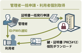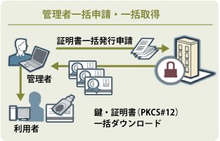 電子証明書を各種デバイスに格納するケースで有効なパターンです。例えば IC カード利用において電子証明書発行申請は管理者が行い、電子証明書の取得と IC カードへの書込みは印刷会社などで行う場合、また情報家電などへ電子証明書を書き込む場合など、大量一括で電子証明書を発行するケースに適しています。このパターンを選択した場合、サイバートラスト電子認証センターにおいて安全に鍵の生成および鍵の保管・復旧をすることが可能です。