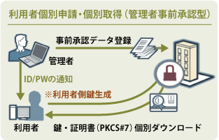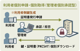 電子証明書記載内容については、利用者の申請に任せ、管理者がその申請内容に応じて承認か拒否を選択して電子証明書を発行するベーシックなパターンです。このパターンでは、利用者側で鍵が生成され、管理者に承認された場合に電子証明書のみを取得します。