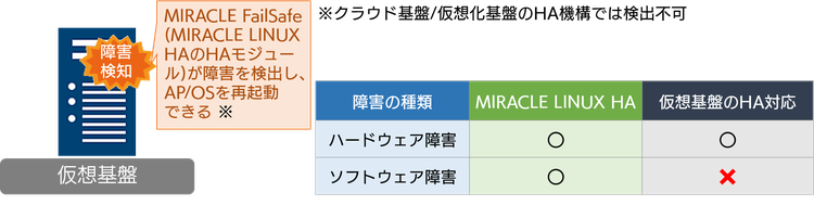クラウド基盤/仮想化基盤において、MIRACLE LINUX HA / MIRACLE HA for AlmaLinux を利用することで、クラウド基盤/仮想基盤の HA 機能で検知しないソフトウェア障害を回避することが可能です。