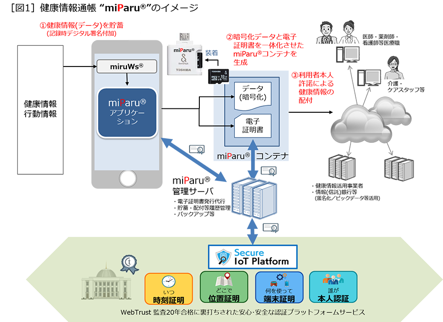 "miParu®"は、放送番組などビデオ用のコンテンツ保護規格である「SeeQVault™ ※4」規格にのっとり SD メモリカード内に設けられた秘匿領域に、電子証明書の認証に必須な秘密鍵を搭載した電子証明書対応 SD メモリカードです。これにより、医療に関わる要配慮個人情報などを個人が安全に持ち運びできます。