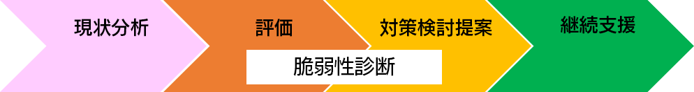 セキュリティ診断は、セキュリティコンサルティングに基づいて、セキュリティ機関の勧告およびサイバートラストのセキュリティ診断および脆弱性診断の実績に基づきその対応を選定します。セキュリティ対策は、その脆弱性に対し、優先順位づけを行い適切な対策の支援を行います。