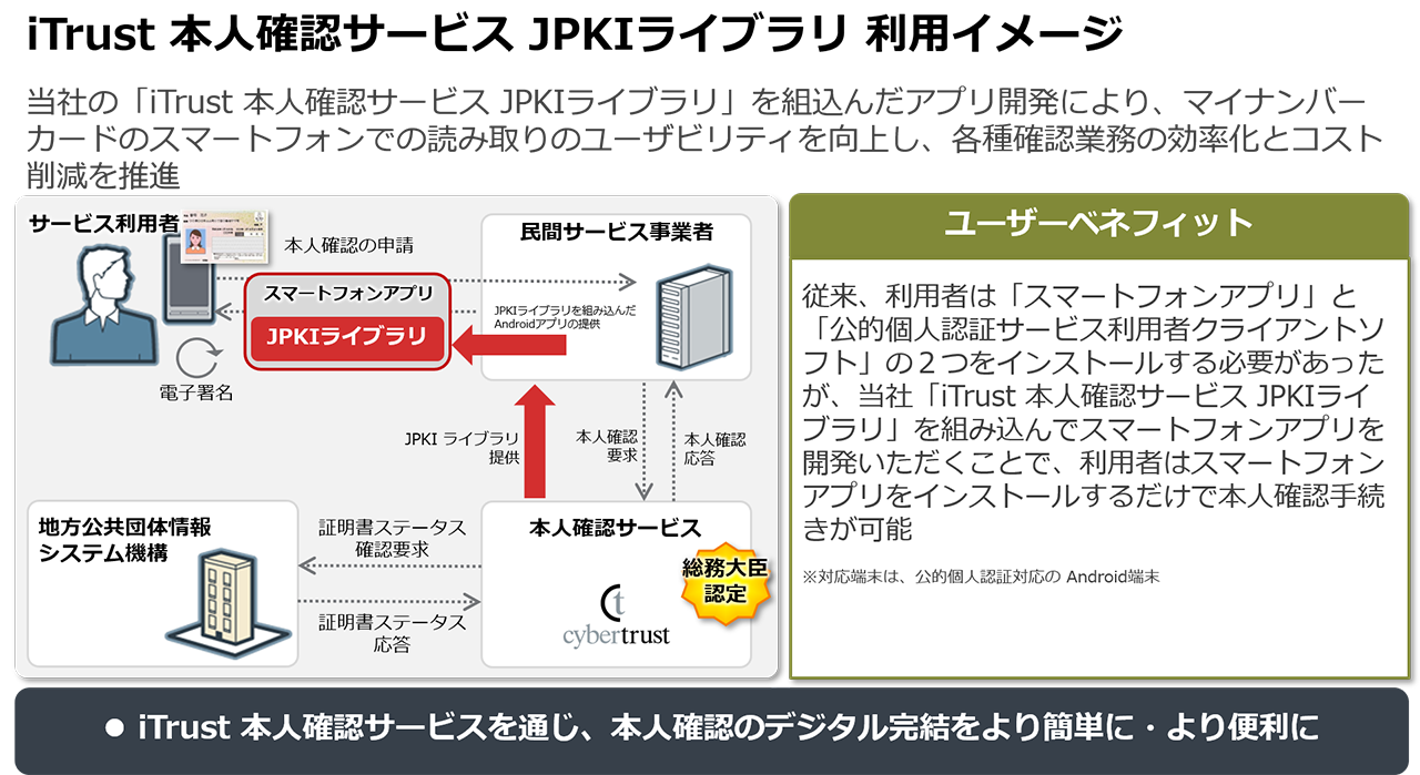 サイバートラスト株式会社(本社:東京都港区、代表取締役社長:眞柄 泰利 以下、サイバートラスト)は、ビジネスプロセスのデジタル化を促進するトラストサービス 「iTrust(アイトラスト)」シリーズの 「iTrust 本人確認サービス」 を Android 端末で容易に実現する「iTrust 本人確認サービス JPKI ライブラリ」 を 2019 年 5 月 21 日より提供開始いたします。