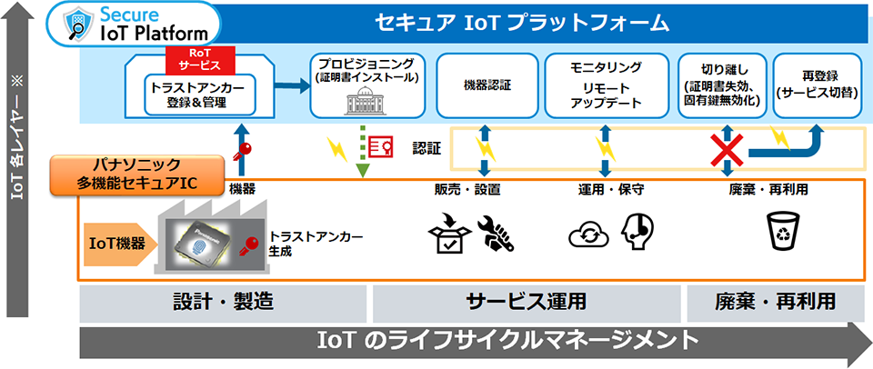 このたびの合意は、IoT 機器の製造から廃棄までライフサイクル全体にわたる安全性向上の実現に向けて、両社の技術やサービスの機能を活用して IoT 機器向けトラストサービス※1の運用基盤を確立する可能性を検討するものです。両社は本合意に基づいて、サイバートラストの「Secure IoT Platform®(以下、SIOTP)※2」と、パナソニックが提供する多機能セキュア IC※3「MN67S3C0 シリーズ」の開発連携について具体的な検討を開始します。