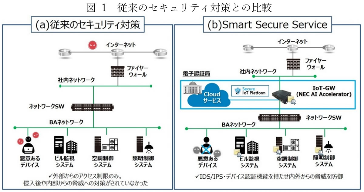 近年、効率的な建物管理や建物の省エネルギー性、利便性・快適性向上のため、BA システムでは建物内外の様々なシステムや IoT 機器とつながり、データを利活用するニーズが高まっています。その反面、ネットワークの統合に伴い規模が大きくなる BA システムを対象としたサイバー攻撃のリスクも大きくなっています。従来の BA セキュリティ対策では、主に建物外部からの脅威に対するファイヤーウォールでの防御に限られ、不正侵入やウイルス感染を前提とした対策が必ずしも十分とは言えませんでした ( 図 1(a))。「Smart Secure Service」は IDS※1/IPS※2 機能と登録済のデバイスを認証する機能を搭載し、万一の不正侵入やウイルス感染に対してもセキュリティをより強固なものとしています ( 図 1(b))。