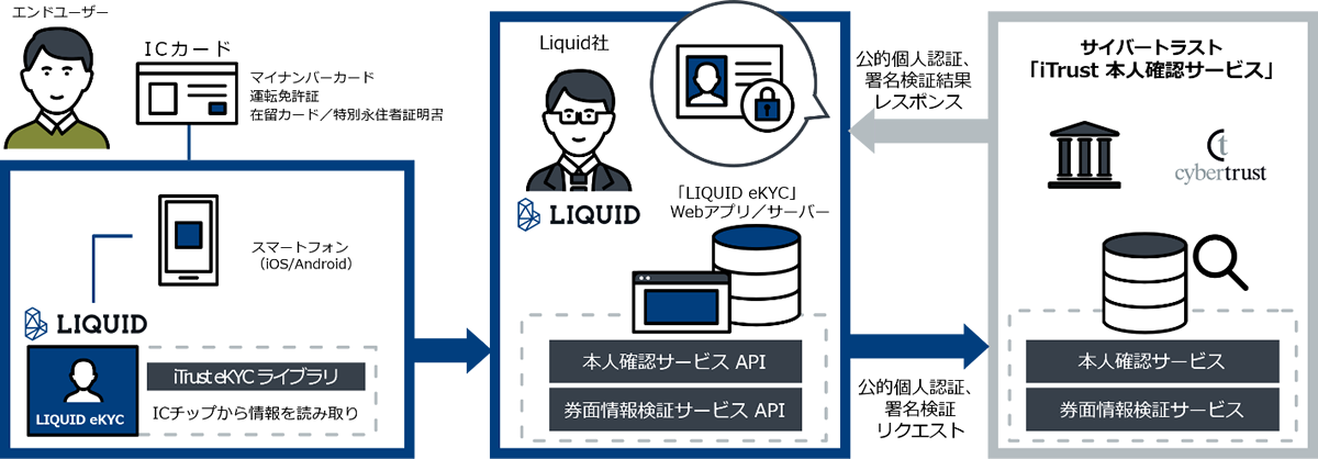 サイバートラスト株式会社(本社:東京都港区、代表取締役社長:眞柄 泰利 以下、サイバートラスト)は、株式会社 Liquid(本社:東京都千代田区、代表取締役:長谷川 敬起 以下、Liquid)と本人確認サービスにおける IC カード読み取り認証の活用で協業することを発表します。本協業により、デジタルトランスフォーメーションにおけるビジネスプロセスのデジタル化を促進するトラストサービス 「iTrust(アイトラスト)」シリーズの「iTrust 本人確認サービス」と、Liquid の本人確認サービス「LIQUID eKYC」を連携し、マイナンバーカードや IC カード免許証、在留カードの読み取りと、券面情報検証サービスによる電子署名検証や公的個人認証を用いた本人確認を実現します。