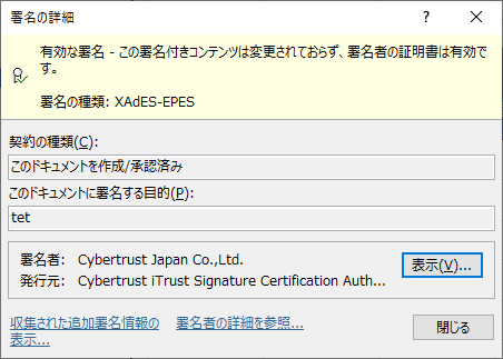 このたびの Microsoft Office ドキュメントも同様に、Microsoft Windows のルート証明書リストに対応しているため、Word や Excel で作成した電子文書において、「有効な署名 – この署名付きコンテンツは変更されておらず、署名者の証明書は有効です。」と表示可能になり、信頼性を視覚的に確認することができます。