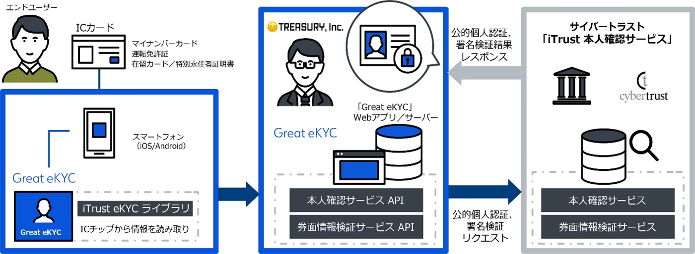 サイバートラスト株式会社(本社:東京都港区、代表取締役社長:眞柄 泰利、以下「サイバートラスト」)と株式会社 TREASURY(本社:東京都渋谷区、代表取締役:山下 誠路、以下「TREASURY」)は、TREASURY が提供するオンライン完結型本人確認サービス「Great eKYC(グレートイーケーワイシー)」に、サイバートラストが提供するデジタルトランスフォーメーションにおけるビジネスプロセスのデジタル化を実現するトラストサービス「iTrust(アイトラスト)」シリーズの「iTrust 本人確認サービス」を導入したことを発表します。「iTrust 本人確認サービス」と連携した「Great eKYC」は、非対面取引でのコンプライアンスを強化したい企業や組織に向けて、本日 TREASURY より提供開始されました。「Great eKYC」と「iTrust 本人確認サービス」の連携により、マイナンバーカードや IC カード免許証などの読み取りと、券面情報検証サービスによる電子署名検証や公的個人認証を用いた厳格な本人確認のデジタル完結を実現します。