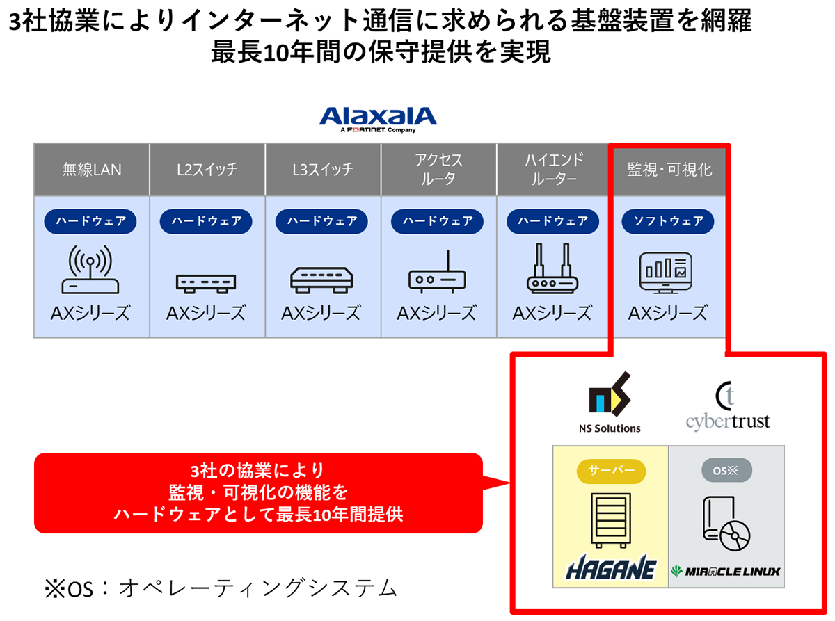 自社開発のスイッチを中心とした、ミッションクリティカル業務向けに多数の実績のある高信頼なネットワーク製品であり、L2/L3 スイッチ・ルータ・無線アクセスポイント ※1 に至るまで、多様なネットワークを構成できる豊富なラインナップを有しています。また、安定稼働に必要な運用管理・監視用ソフトウェアも提供しており、最長 10 年の保守対応を実現させています。 - サイバートラスト/オペレーティングシステム「MIRACLE LINUX」