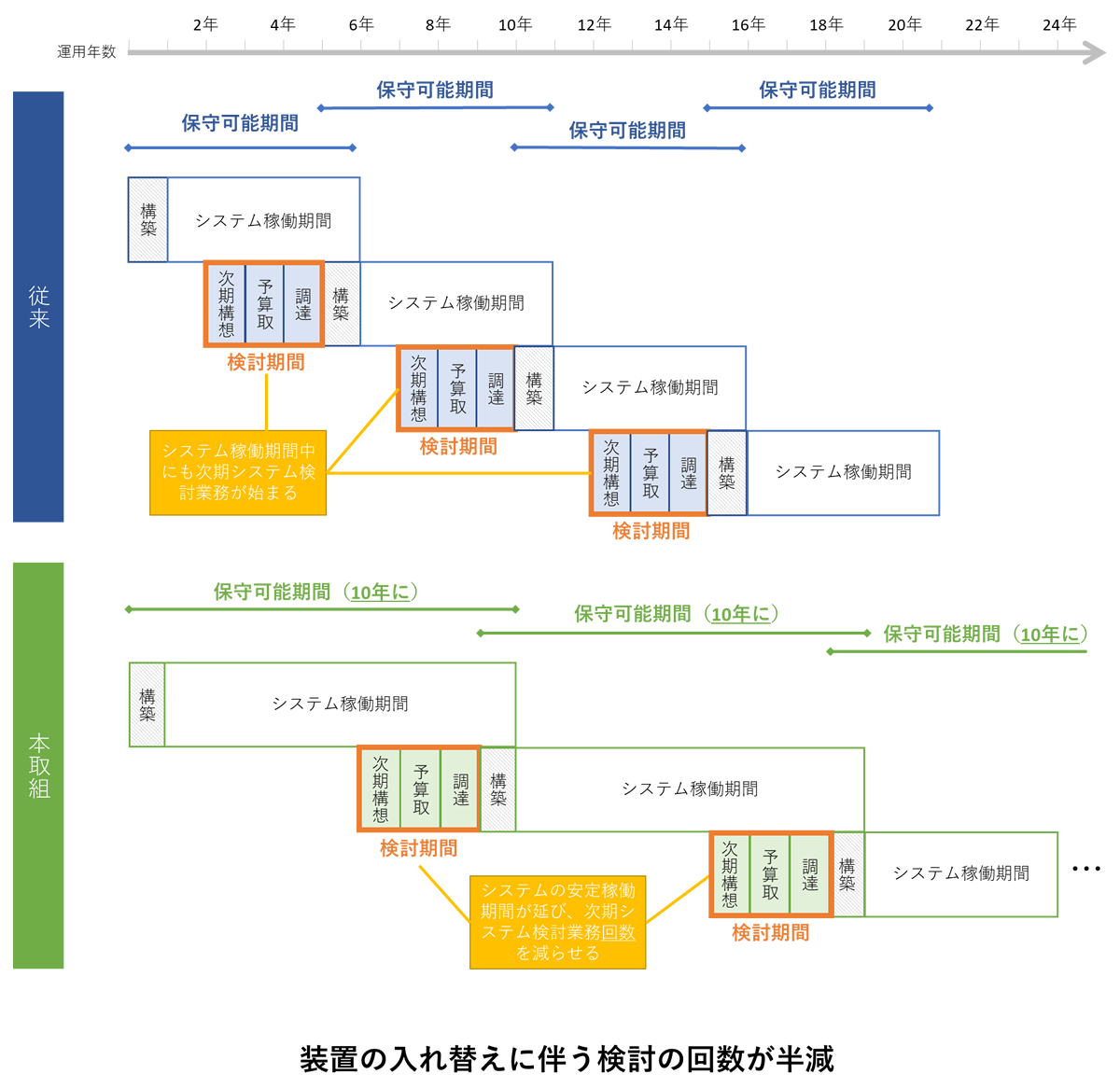 企業・公共団体で用いられているネットワーク(例:LAN・WAN 基盤)の装置耐用期間は概ね 5 年程度であり、定期的に入れ替えを行います。準備・移行期間を踏まえると、現状の耐用期間内に入れ替えを行うためには、導入後、すぐに次の入れ替えの計画業務に入る必要があります。企業・公共団体の情報システム部門にとって、この計画業務は予算整理・設計・実装など負荷が高く、また数年がかりで行う長期プロジェクトとなります。短いスパンで計画業務が発生することは、情報システム部門が ICT インフラ維持に多くの工数を割くことにつながり、その結果、企業成長に必要な ICT 戦略にリソースをかけきれないという課題が生まれます。