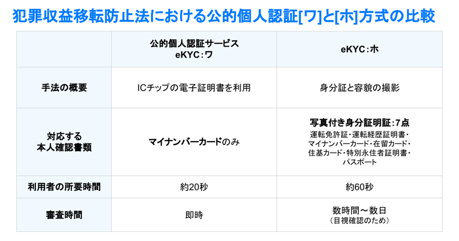 現在、eKYC(オンライン本人確認)で主に採用されている [ ホ ] 方式との比較では、[ ワ ] 方式の方が利用者の所要時間が短く、審査の時間も即時で終わるため、利用者がマイナンバーカードを保有している場合、公的個人認証サービスの方がスムーズに本人確認が完了します。