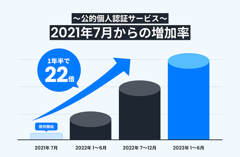 サイバートラストと TRUSTDOCK が TRUSTDOCK の eKYC サービスを通じて行政や民間企業へ提供している公的個人認証サービスは、提供を開始した 2021 年 7 月〜12 月の半年間を基準にすると、2023 年 1 月〜6 月では約 22 倍に増加しました。