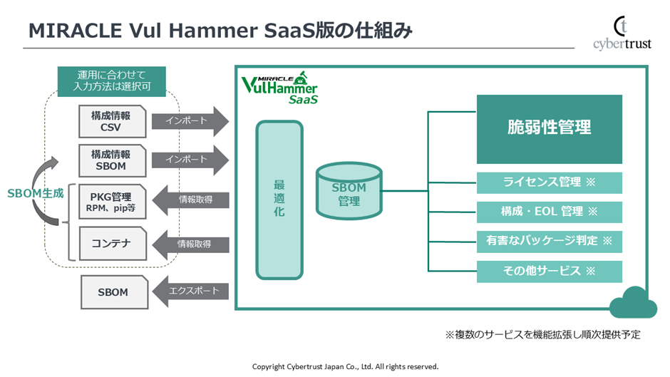 サイバートラスト株式会社(本社:東京都港区、代表取締役社長:北村 裕司 以下、サイバートラスト)は、サーバーやネットワーク機器に内在する脆弱性の可視化と対応を自動化する脆弱性管理ツール「MIRACLE Vul Hammer(ミラクル バル ハンマー)」の最新版を 2024 年 10 月 29 日より提供開始します。このたびの最新版は SaaS として提供し、SBOM のインポート機能の強化により、複数のソフトウェアで構成されるシステムにおいて複数のベンダーから提供される異なる形式の SBOM を統合管理可能にします。SBOM を用いた効率的な脆弱性管理の導入をより容易に実現することにより、ソフトウェアサプライチェーンセキュリティ対策とシステム運用コストの削減を支援します。