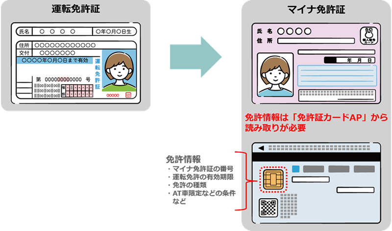 マイナンバーカードと運転免許証を一体化したマイナ免許証が 2025 年 3 月 24 日より運用開始となります。マイナ免許証は、マイナンバーカードの IC チップにある空き領域に、警察庁のアプリケーション「免許証カード AP」を登録したもので、免許情報は電磁的方法により記録され、カード券面には記録されません。このため、事業者が利用者からマイナ免許証の提示を受けても、IC チップを読み取り免許証カード AP から免許情報を読み取ることが必須になります。
