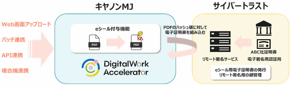 このたび、キヤノンMJ とサイバートラストは、企業間でやり取りされる電子文書の安全性と信頼性の強化に向け、トラスト※3分野での協業を開始します。キヤノンMJ が提供するデジタルドキュメントサービス「DigitalWork Accelerator」とサイバートラストの「iTrust リモート署名サービス」および「iTrust eシール用証明書」を連携し、「DigitalWork Accelerator」で管理する PDF 形式の電子文書に eシールを自動付与する機能を 2026 年 1 月下旬より提供開始します。