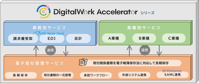 「DigitalWork Accelerator」シリーズは、電子帳簿保存法に対応した電子取引管理サービス、請求書受取サービスに加え、業務別アプリケーション・業種向けサービスを連携させることで、DX 推進と業務変革の実現を支援するクラウドサービスです。企業の「情報資産」であるドキュメントを安全に管理・保存し、多様な手段で適切に分類・検索できる環境を提供します。さらに、複合機やさまざまなサービスと連携し、社内外の情報をスムーズに活用可能な「価値ある資産」へと変革します。