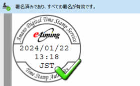電子文書にタイムスタンプを付与することで、付与された時刻に書類が存在していたことに加え、付与時刻以降は書類が変更されていないことを証明します。本サービス内でお客さまの業務および書類種別に応じてタイムスタンプと eシールの使いわけが可能です。