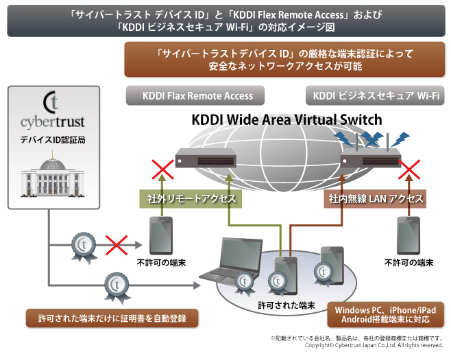 サイバートラストの「サイバートラスト デバイスID」が、 KDDIの「KDDI Flex Remote Access」と「KDDI ビジネスセキュアWi-Fi」に採用