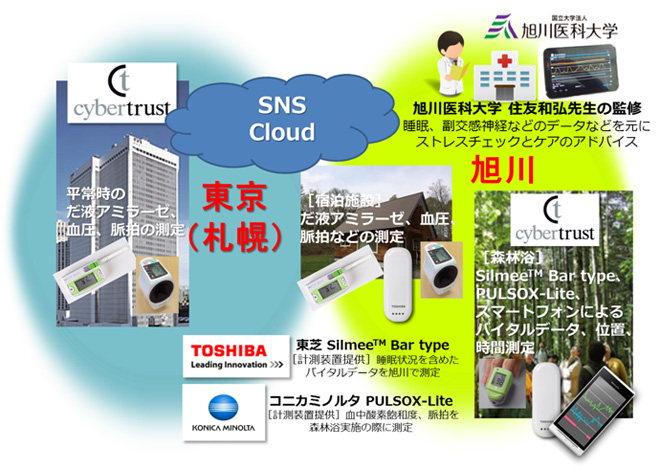東芝が提供する超小型・軽量のインテリジェント生体センサモジュール「SilmeeTM」により、心電位・脈波・体動等を計測し、スマートデバイスに転送を行います。転送されたデータならびにコニカミノルタが提供するパルスオキシメータ「PULSOX-Lite(パルソックスライト)」で血液中の酸素飽和度、脈拍を測定し、旭川医科大学 住友和弘先生によるストレスチェックを実施、各個人へのフィードバックとともに、森林浴によるメンタルヘルスケア効果を測定します。 スマートデバイスによって旭川医科大学 住友和弘先生とやりとりされるプライバシー情報は、サイバートラストの電子認証の技術を活用し、安全にデータの送受信を実現します。