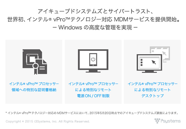 アイキューブドシステムズとサイバートラスト、世界初、インテル® vPro™ テクノロジー対応 MDM サービスを提供開始。Windows の高度な管理を実現。