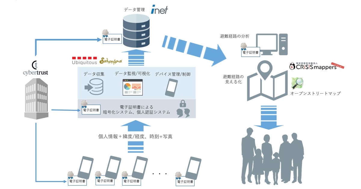 そこで今回アイネット、サイバートラスト、ユビキタス、クライシスマッパーズ・ジャパンはそれぞれの持つ技術を活かしてこの仕組みを支援します。