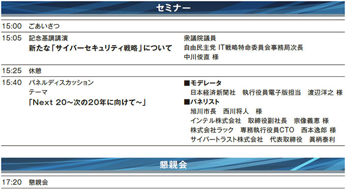 サイバートラストカンファレンス 2015 は「Thanks20! Next20!」をメインテーマとし、「これまでの 20 年」に感謝するとともに「これから先 20 年」のビジネストレンドについて皆様と率直に意見交換できる場を持たせていただきたいと考えて企画いたしました。