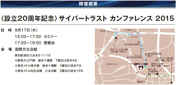 この度サイバートラストでは、2015 年 9 月 17 日に、創立 20 周年記念 サイバートラスト カンファレンス 2015 を開催させていただく運びとなりました。