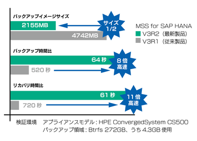 HPE ConvergedSystem CS500 を利用し、Btrfs 272GB(うち 4.3GB 使用)領域のバックアップ / リストア検証において、従来の MSS V3R1 と比較してパフォーマンスを向上