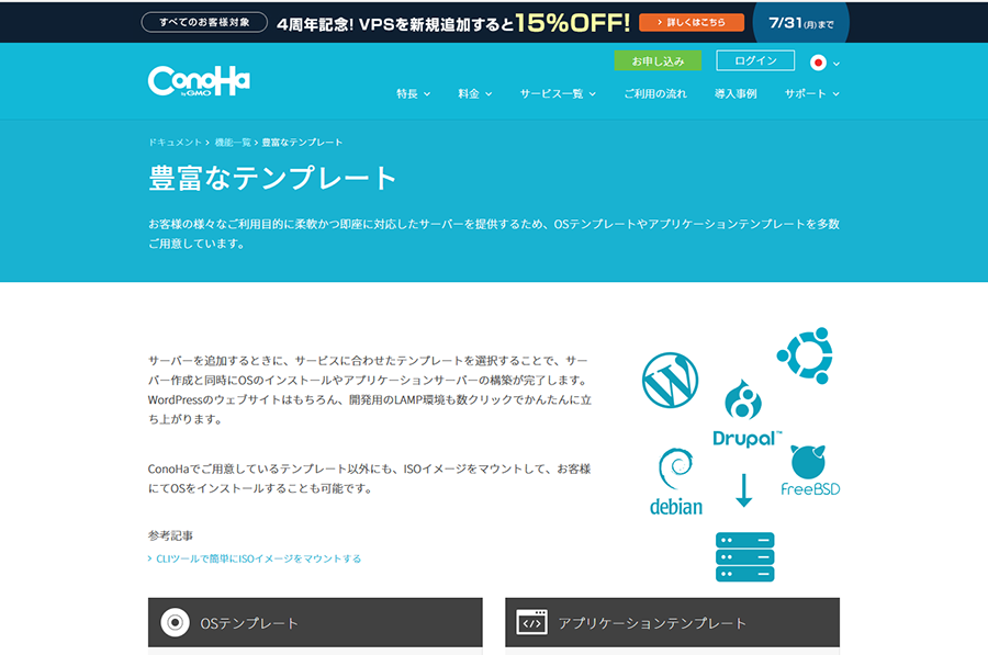 「ConoHa」は、お客さまのビジネスやトラフィックの規模に応じたシステムを柔軟に構成でき、定額制と時間課金の組み合わせにより最小コストで利用できる料金体系が特徴の VPS サービスです。「ConoHa」には、OS テンプレートやアプリケーションテンプレートが多数用意されており、お客さまのサービスに合わせたテンプレートを選択することで、サーバー構築と同時に OS のインストールやアプリケーションサーバーの構築を完了することができます。